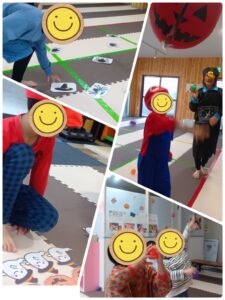 おばけカボチャにボールを当ててカボチャ割りをしたり、おばけを探せ!ゲームをしたり、絵合わせハロウィンをしたりして楽しみました♪ カボチャの顔の切り抜きにボールを投げて入れたり、フリスビーを投げて入れてみたりなど、力加減が必要な遊びではありましたが、子どもたちは喜んで参加してくれました。